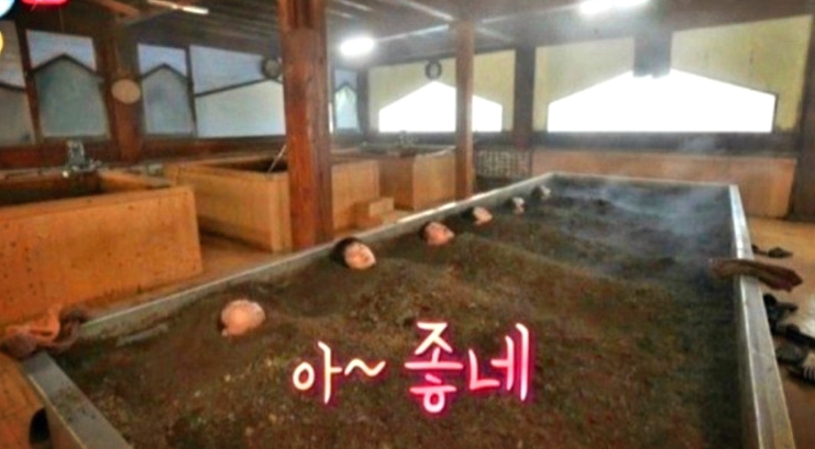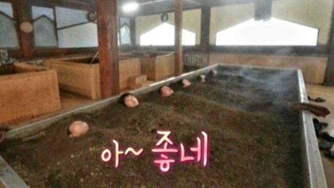 나혼자산다 전현무 찜질방에서 제일 눈에 띄는 장면이 저 흙속에 들어가있는 장면이였는데요. 저 장면은 흙이 아닌, 따뜻한 효소안에 얼굴만 내놓고 온 몸을 묻고 찜질을 하는 장면이라고 하네요. 저렇게 찜질을 하면 온 몸에 쌓인 노폐물들이 쉽게 배출된다고 합니다.