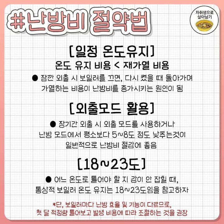 -> 이 말은 즉! 잠깐 외출할때 보일러를 아예 꺼버리거나 외출모드를 해버리면, 다시 보일러를 켰을 때 재가열되는 비용이 더 크다는 뜻입니다. 난방비를 더 증가시킵니다. 현재 온도보다 1도정도만 낮게 설정후 잠시 외출해주세요.