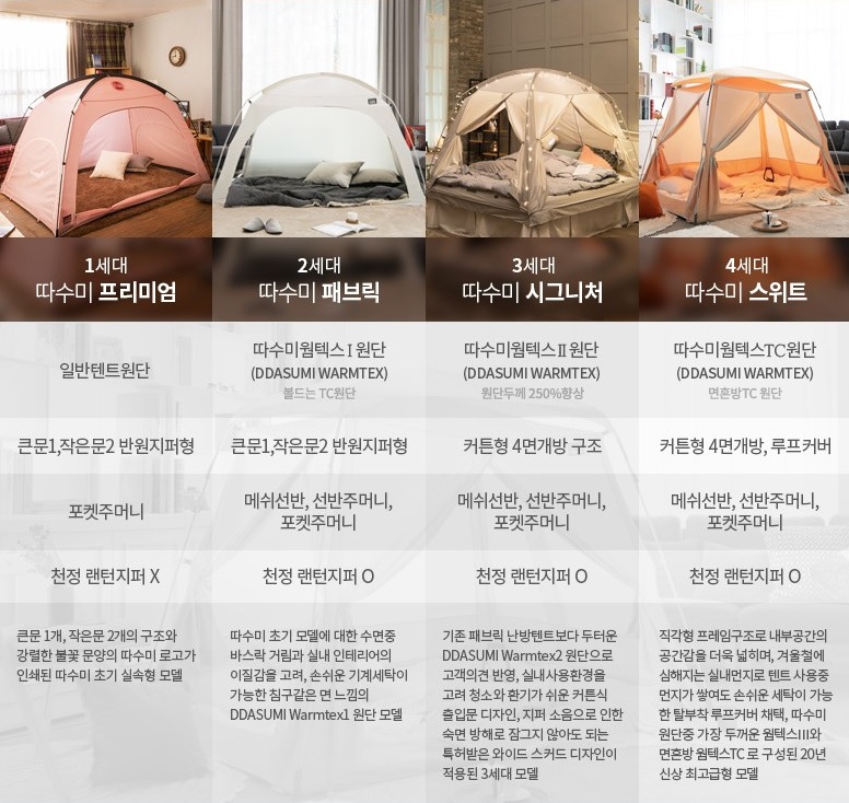 그래서 난방비 아끼는법에 대해서 포스팅해보도록 하겠습니다. 일단 오늘 주된 주제로는 집집마다 다른 브랜드의 보일러가 설치되어 있을 것입니다. 린나이, 경동나비엔, 귀뚜라미, 대성쎌틱 등이 있을 것입니다. 보일러 종류별 난방 절약하는 설정법에 대해서 포스팅을 할 것입니다. 하지만 보일러도 보일러지만 자취생이나 혼족, 혹은 아이키우는 집은 "난방텐트" 추천드리고 싶습니다. 저도 '난방텐트'가 막 나오기 시작하던 5~6년전쯤 그당시 핫아이템이였던 "따수미 난방텐트"를 구입해서 집안에 설치 후 써본적이 있었습니다. 아래 사진을 보면 제가 쓰던건 1세대 따수미 프리미엄 텐트 였던 것 같은데, 지금은 4세대 따수미 난방텐트까지 나왔네요. 그만큼 기능도 더 좋아지고 디자인도 예뻐진게 보이네요. 관심있으신 분들은 아래 사진 참조하세요.