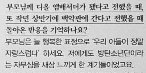 A. 방탄소년단 지민🐣: "부모님은 늘 행복한 표정으로 '우리 아들이 정말 자랑스럽다' 하세요. 저에게도 방탄소년단이라는 자부심을 새삼 느끼게 한 계기들이었고요. "
