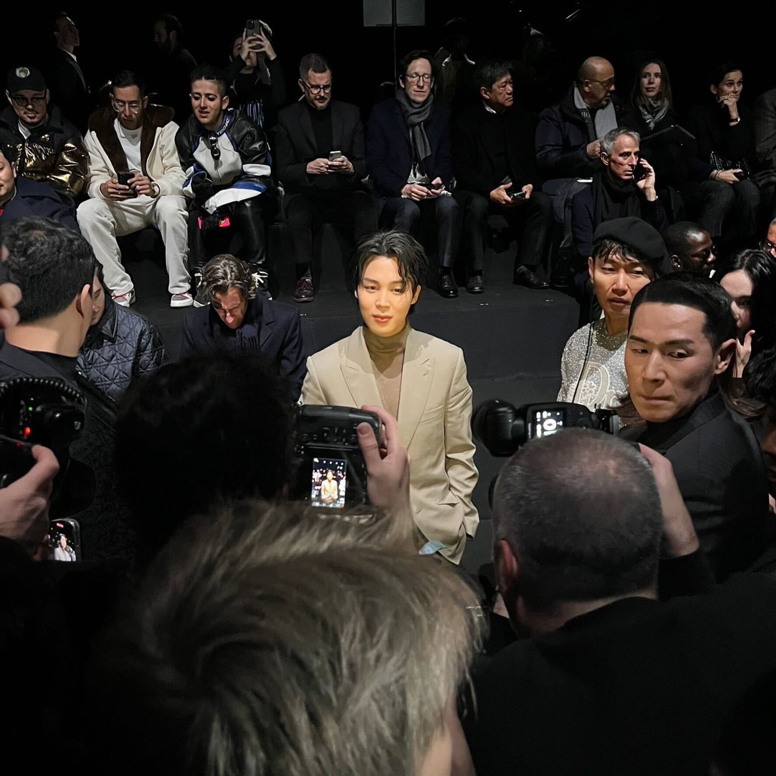 서포트라이트를 받고 있는 주인공 느낌의 방탄소년단 지민의 사진, 디올 패션쇼장 내부에서 찍은 방탄소년단 지민입니다.