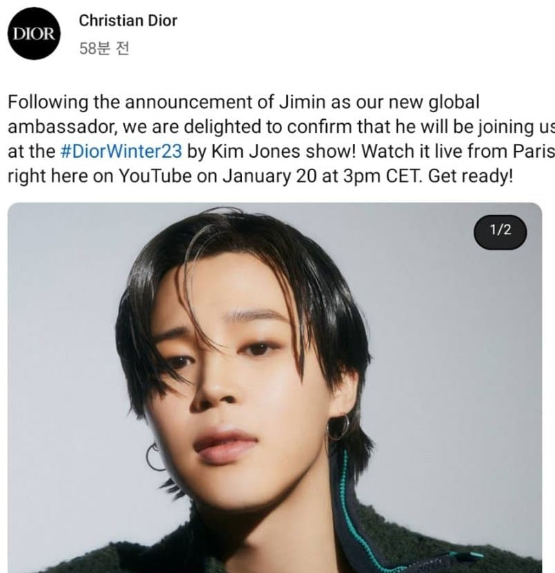 크리스천 디올의 공식 인스타그램 계정에서 2023년 1월 20일 오후 3시 (CET-유럽표준시간)에 디올 공식 유튜브 채널에서 방탄소년단 지민의 패션쇼 참석 영상 및 생중계 예정이라고 공지사항이 떴습니다.