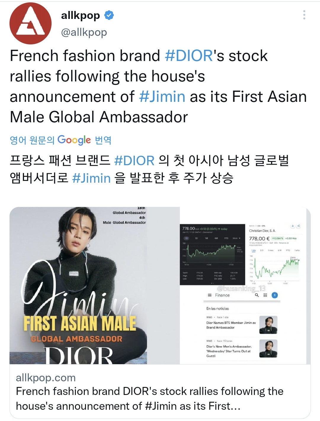 1992년 '디올' 상장 이후 31년 만에 최고가를 기록했습니다. 이럴 줄 알았으면 '디올'의 주식을 샀었어야....... 같은 한국인이란 게 자랑스럽고 大슈퍼스타의 영향력이 무엇인지를 강력하게 보여주는 방탄소년단 지민의 행보였습니다. 감사합니다.
