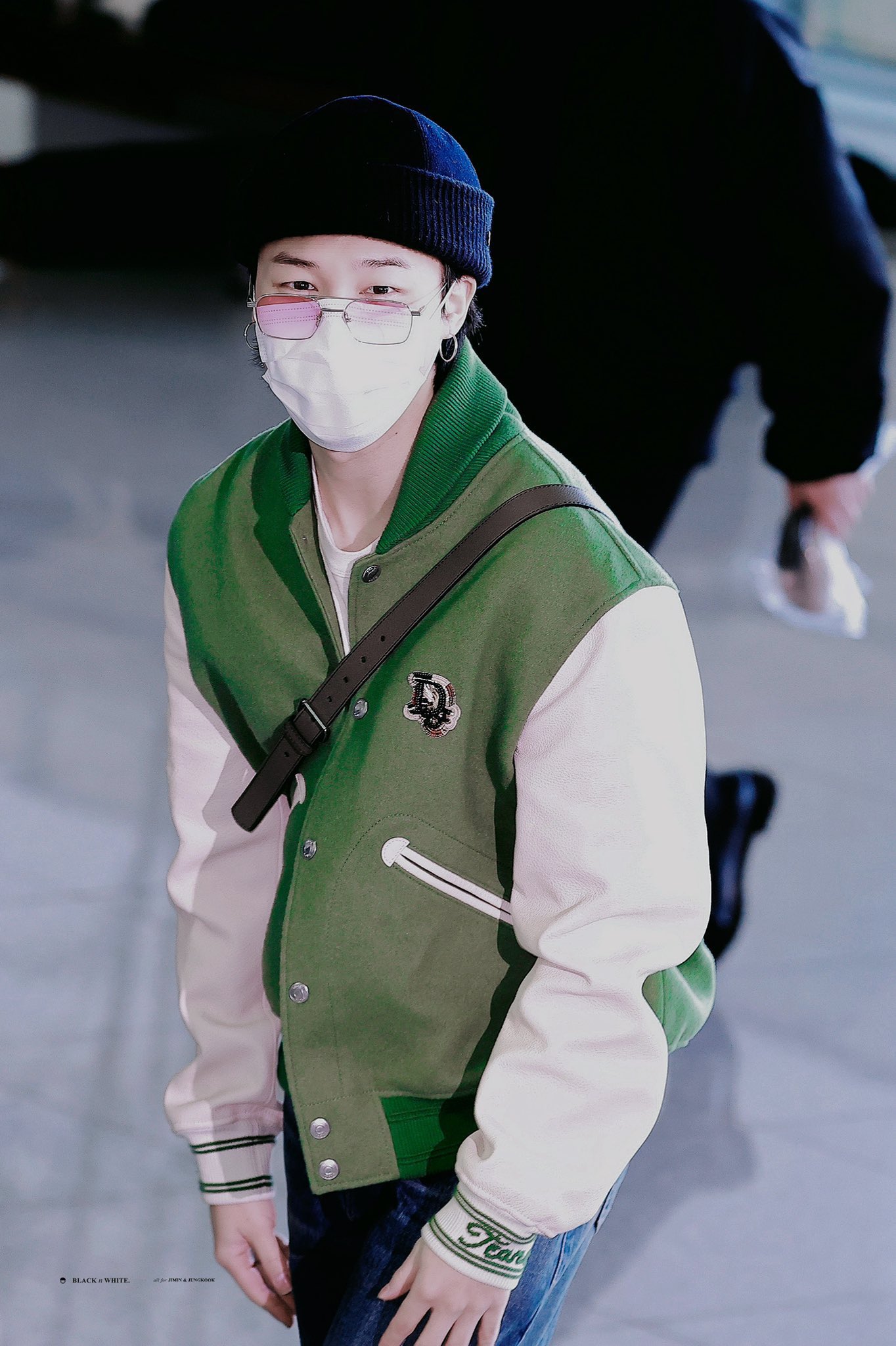 공항에서 방탄소년단 지민이 입은 바시티 재킷(초록 블루종)은 아직 출시되지 않은 2023년 초가을 남성 디올(Dior) Tears 컬렉션 한정판이라고 합니다. 역시 디올 글로벌 앰버서더 지민입니다.
