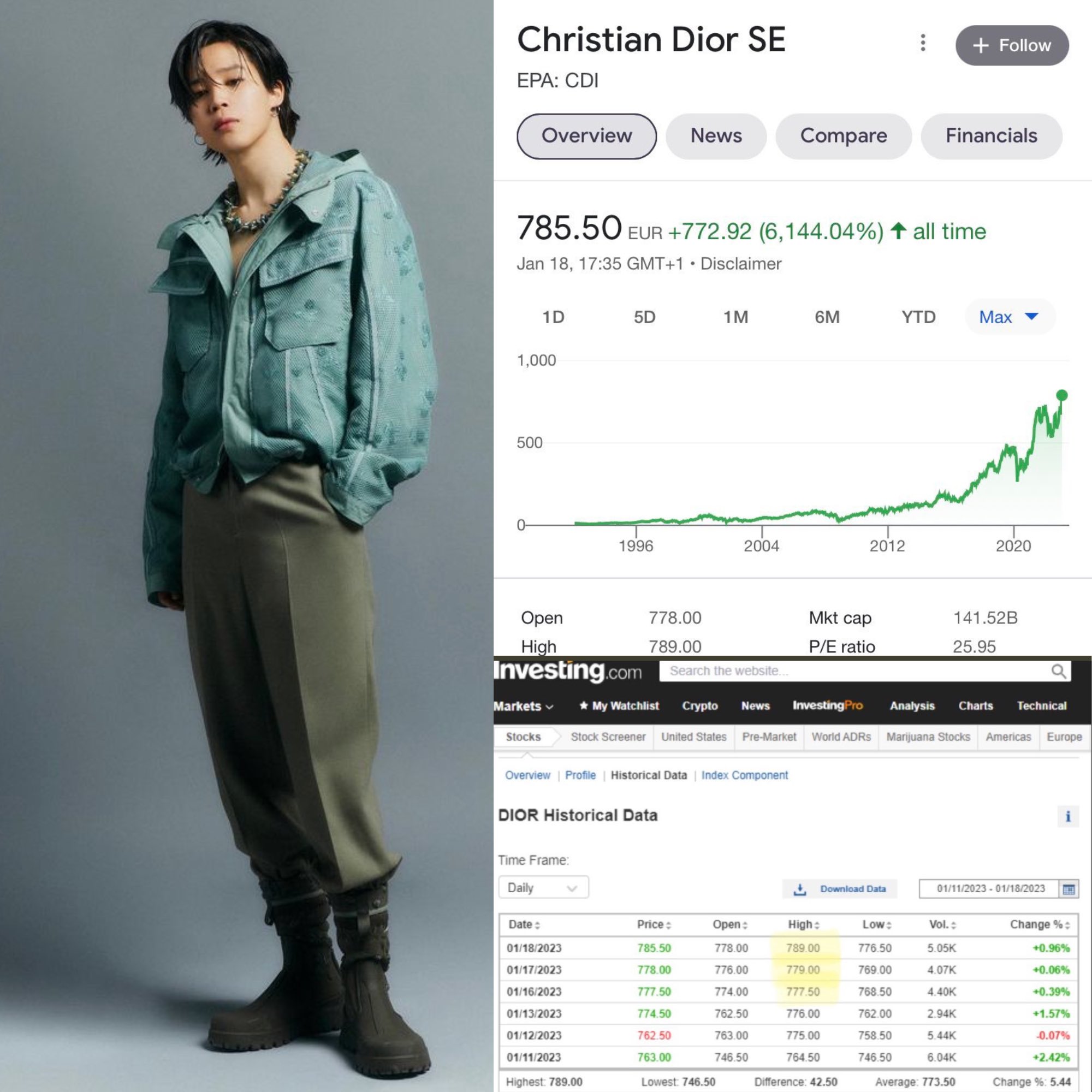 1992년 '디올' 상장 이후 31년 만에 최고가를 기록했습니다. 이럴 줄 알았으면 '디올'의 주식을 샀었어야....... 같은 한국인이란 게 자랑스럽고 大슈퍼스타의 영향력이 무엇인지를 강력하게 보여주는 방탄소년단 지민의 행보였습니다. 감사합니다.