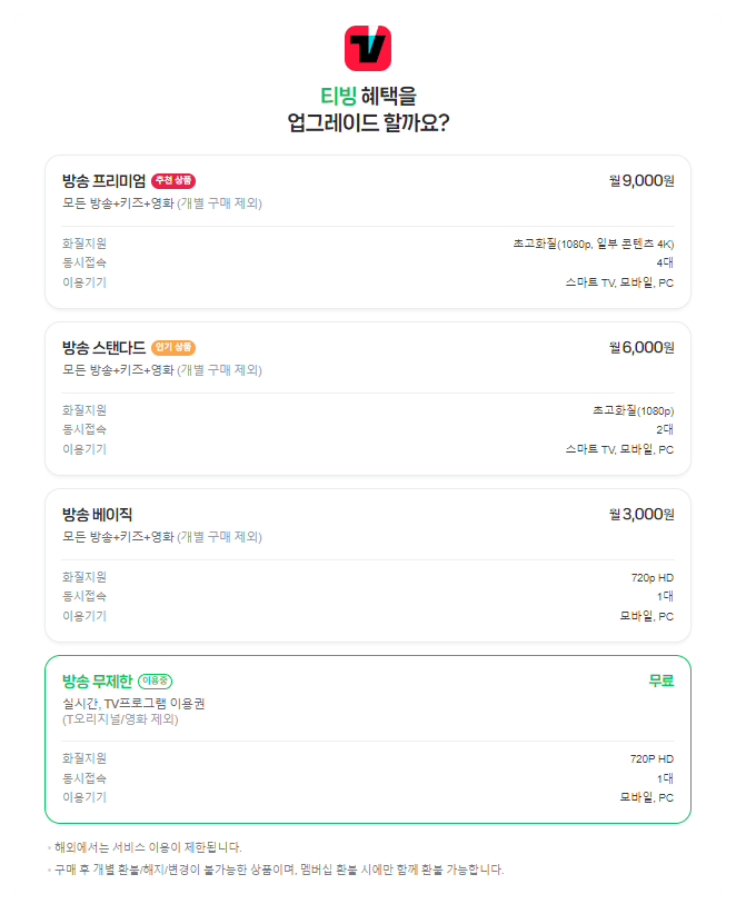 지원해주늘 영상 콘텐츠 OTT가 바로 티빙(TVING) 이용권입니다. 자주보는 드라마가 tvN 티비엔 드라마라면 티빙 보시는거 괜찮습니다