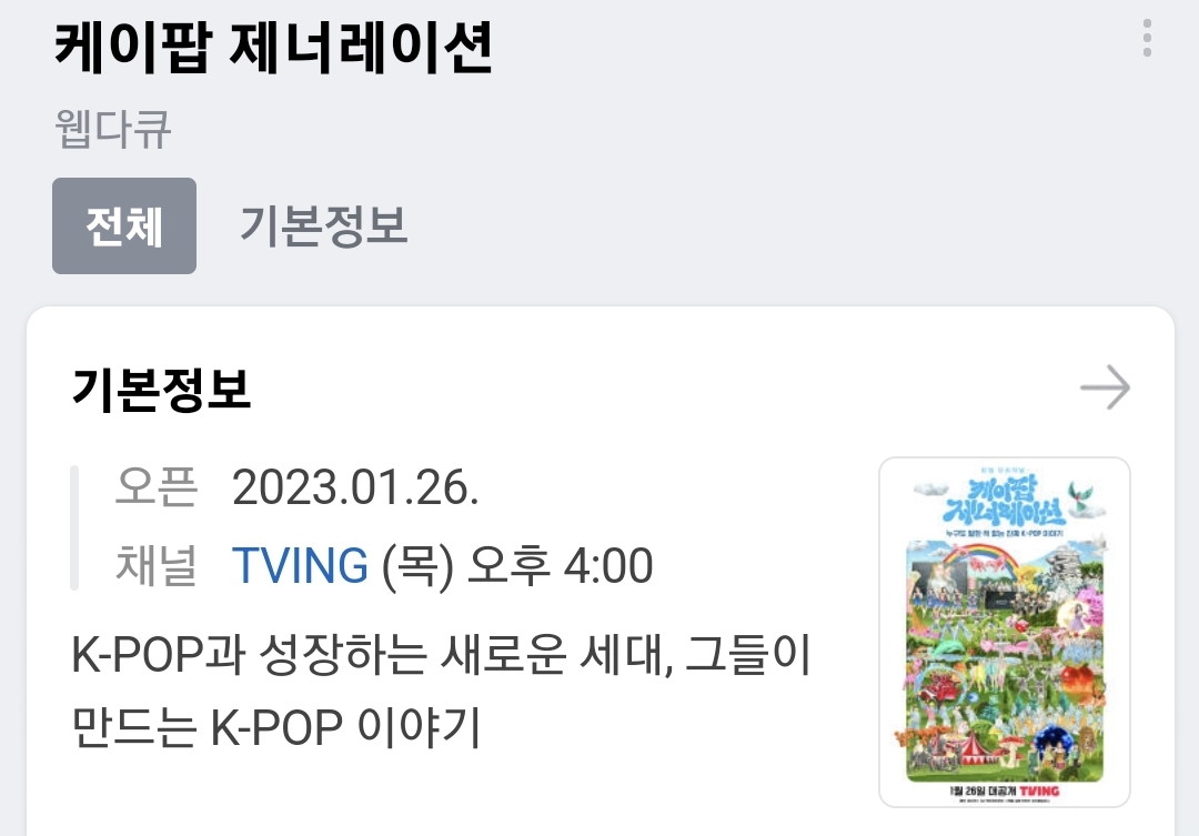 '케이팝 제너레이션'은 K-POP과 성장하는 새로운 세대, 그들이 만드는 K- POP 이야기라는 주제로 TVING을 통해서만 볼 수 있는 웹다큐이자 웹컨텐츠입니다.