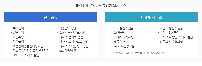 행복출산 원스톱 서비스 신청에서 전국공통으로 신청 가능한 출산지원 서비스와 지자체내에서 신청 가능한 출산지원 서비스를 구분해서 정리해놨습니다. '전국공통'으로 되어있는 부분은 부모급여, 양육수당, 아동수당, 해산급여, 여성장애인출산비용지원, 저소득층기저귀.조제분유지원, SRT 다자녀 가족할인, 첫만남 이용권, 출산가구 전기료 경감, 다자녀 전기료 경감, 다자녀 도시가스료 경감, 다자녀 지역난방비 경감, KTX 다자녀 행복 의 서비스입니다. 그 외에 지자체 서비스는 지자체별로 상이하니 지자체의 조건을 확인 후 신청하시면 되겠습니다. 오늘 신청하는 '부모급여'는 전국공통이니 신청가능합니다.