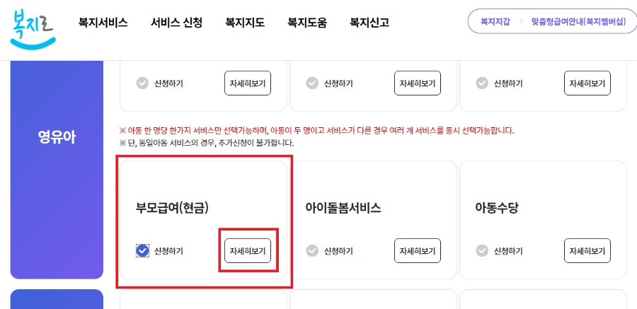 서비스 신청을 클릭해서 들어가면 영유아 부분에 "부모급여(현금)" 란에 신청하기 선택하세요. "자세히보기"를 누르면 부모급여에 대한 자세한 설명이 나오니 읽어보시는 것도 좋습니다. "부모급여(현급)" 체크한 후, 스크롤바를 밑으로 밑으로 쭉쭉~~ 내리면 아래와 같은 화면이 나옵니다.