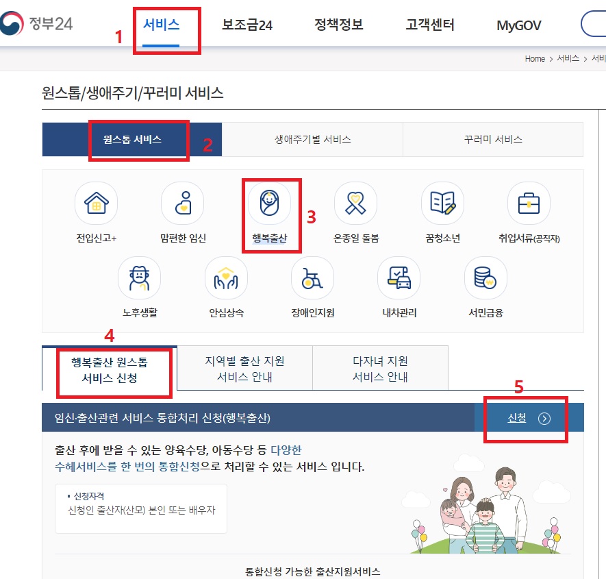 서비스 -> 원스톱서비스 -> "행복출산" -> 행복출산 원스톱 서비스 신청 -> 신청 클릭하시면 됩니다. 정부24 사이트의 행복출산 원스톱 서비스란 임신, 출산과 관련된 서비스를 통합적으로 신청할 수 있는 카테고리입니다. 출산 후에 받을 수 있는 양육수당, 아동수당, 가족수당 등 다양한 수혜서비스를 한 번의 통합신청으로 처리할 수 있습니다. 신청자격은 물론 신청인인 출산자 본인, 산모 본인 혹은 배우자가 해당됩니다.