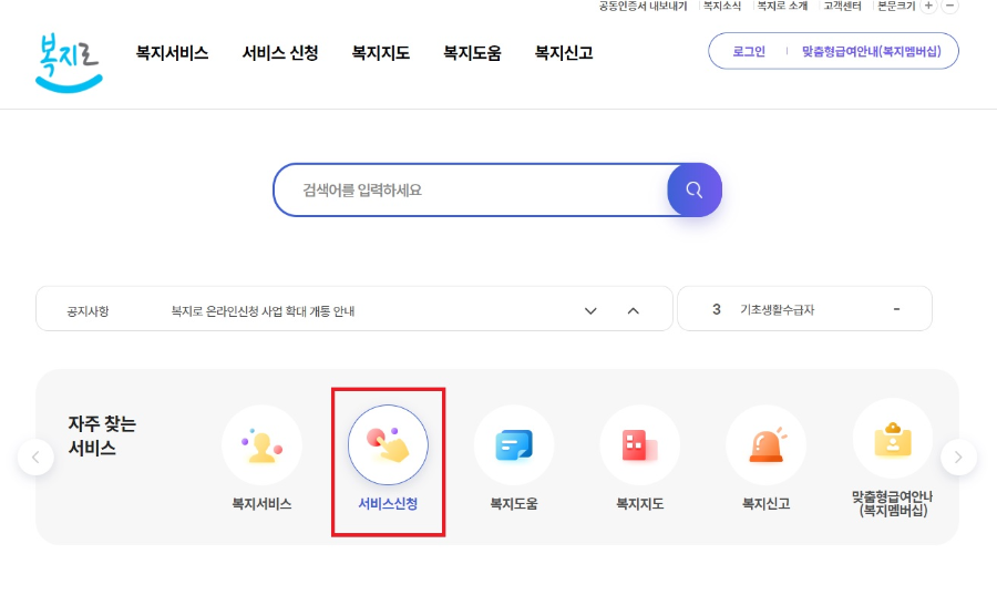 인터넷 신청 방법은 두가지 방법이 있습니다. 복지로에서 신청하는 방법과 정부24사이트에서 신청하는 방법이 있는데 복지로 사이트 (www.bokjiro.go.kr)접속후, 신청하는 방법부터 알려드리겠습니다. 복지로 사이트 접속후 로그인하세요. 메인화면에 보이는 "서비스신청" 클릭해주세요.