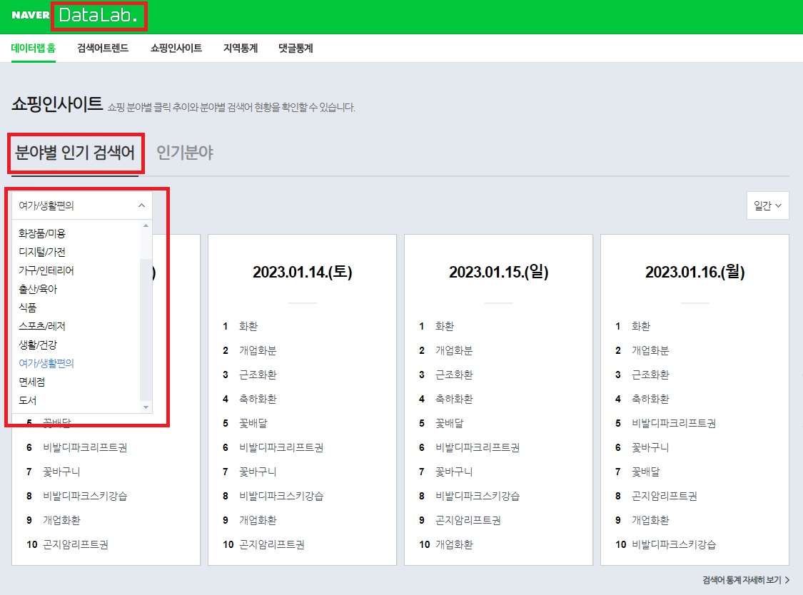 네이버 데이터랩에 들어오면 분야별 인기검색어를 알 수 있습니다.