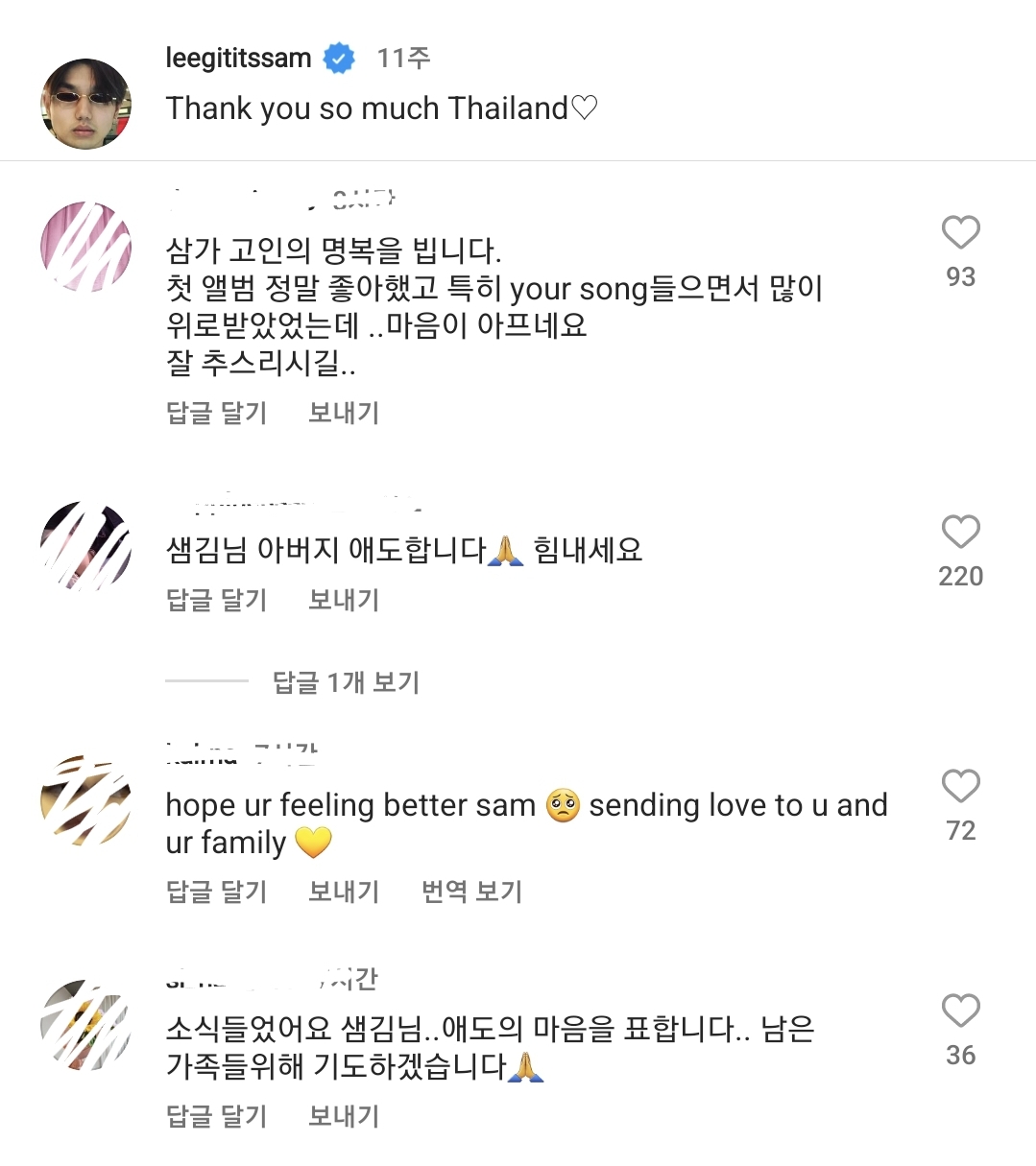 샘킴 인스타그램엔 수많은 이들의 애도 메시지가 이어집니다