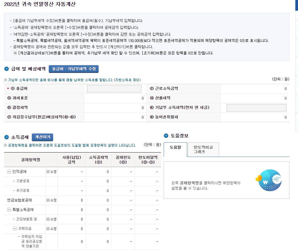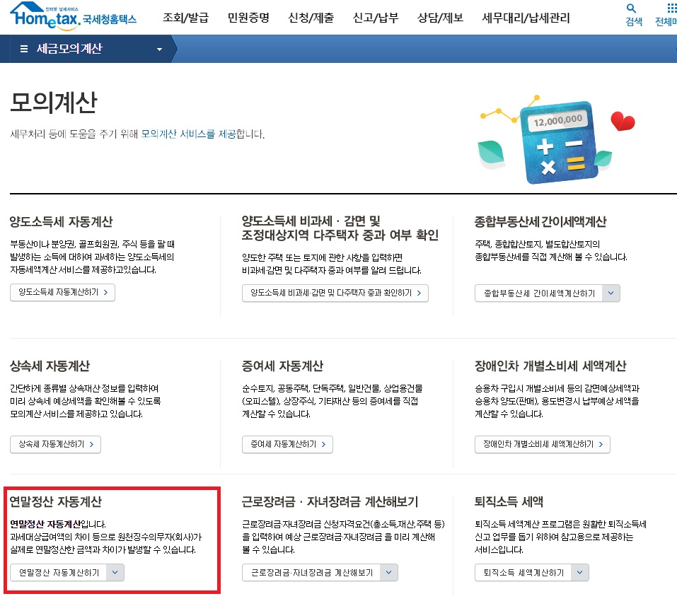 왼쪽 하닥의 '연말정산 자동계산'의 활성창을 클릭해주세요.