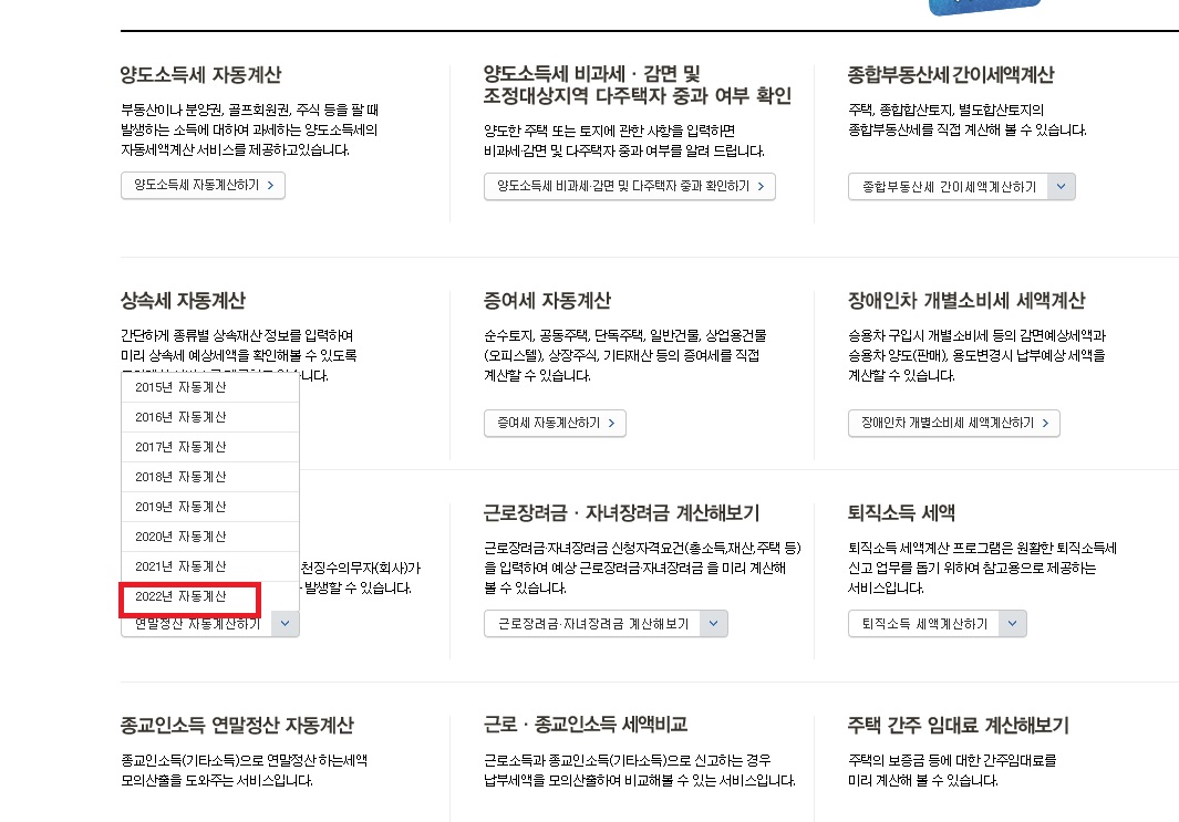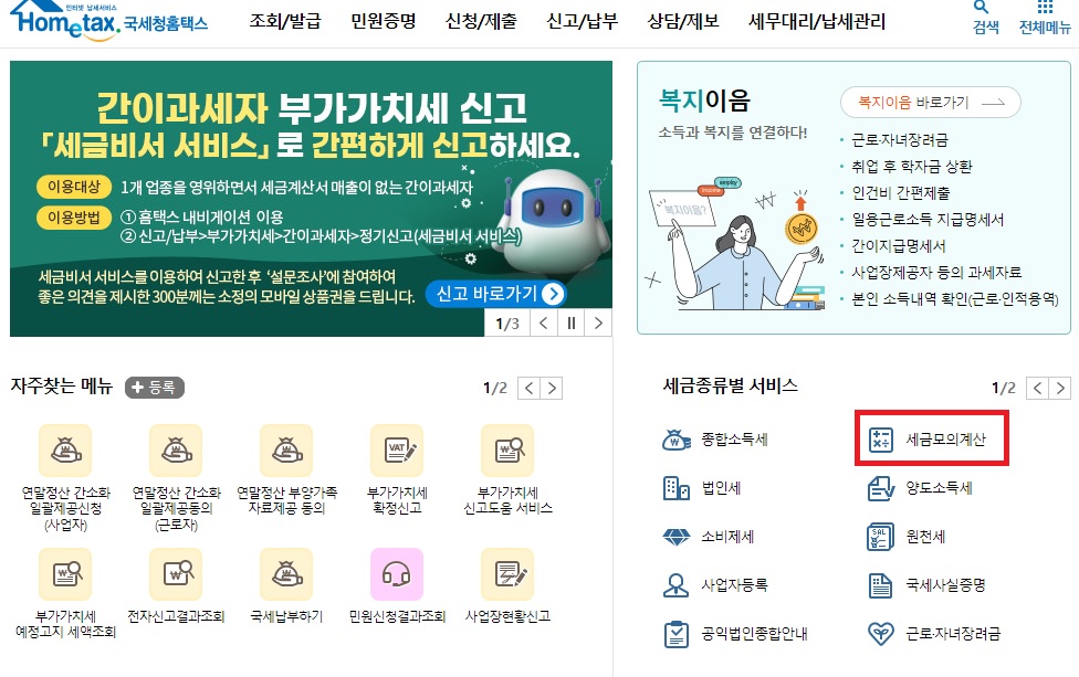 국세청솜택스 사이즈 접속하면 오른쪽 아래쪽에 '세금모의계산' 클릭하세요.